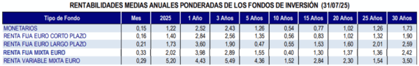 Según datos de Inverco, esta es la rentabilidad acumulada a cierre de julio de 2025 de distintas categorías de fondos: