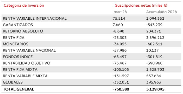 En términos de suscripciones y reembolsos, y a pesar de las incertidumbres, siguieron las entradas netas en Renta Variable Internacional y, de forma más tímida, en Garantizados. Por el lado contrario, se vieron en marzo importantes reembolsos en Globales, Renta Variable Mixta y Renta Fija Mixta.