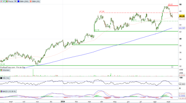 Inditex está en tendencia alcista de largo plazo. Con la subida de hoy, supera la resistencia que tiene en la zona de 47,50 y fijaríamos el siguiente objetivo en sus máximos históricos de 49,61, que alcanzó a finales de agosto. La superación de este nivel reforzaría el escenario alcista.