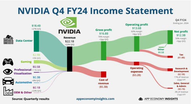 En este sentido, Nvidia ha apostado fuerte por la IA y los datos de crecimiento de la compañía en 2023 son espectaculares (crece un +265% en ingresos hasta los 22.103M$ y un +491% en beneficios hasta los 12.839 M$).