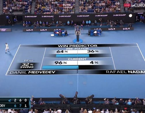 Creo que muchos de nosotros recordamos que Medvedev ganaba por 2 set a 0 y que tuvo 3 bolas de break para poner el 4-2 en el tercer set. La probabilidad de una victoria de Medvedev en ese preciso momento era de 96%; sin embargo, Nadal le dio la vuelta al partido y lo ganó. Nadal rompió la estadística.