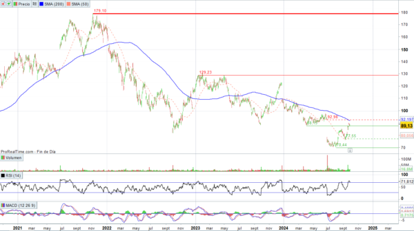 Nike está en tendencia bajista de largo plazo, desde que alcanzara su máximo histórico a finales de 2021. En las últimas semanas ha rebotado desde la zona de 70, donde parece haber formado un suelo, hasta la zona de 90. Con la fuerte caída de hoy, tras presentar resultados, esperaríamos indicios de formación de suelo antes de plantear una posible entrada.