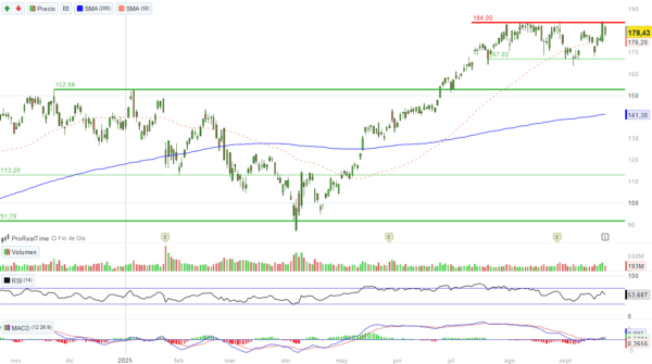 La tendencia de largo plazo es alcista. A corto-medio plazo está consolidando en un rango lateral entre las zonas de 167 y 184. La subida tras el acuerdo con OpenAI se detuvo precisamente en la resistencia del extremo superior de este rango lateral. Se podría aprovechar un retroceso a la parte baja del rango para incorporarse a la tendencia alcista de largo plazo.