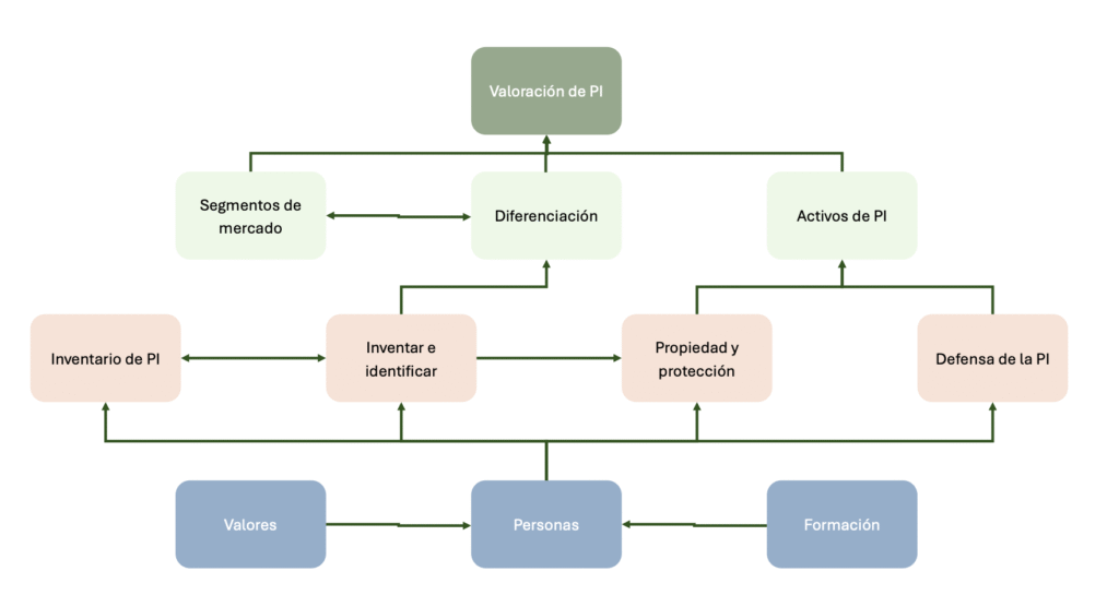 Las personas con conocimiento ejecutan procesos y proyectos. Esos procesos y proyectos llevan a la consecución de la diferencia en el mercado y, en última instancia, a la creación de valor en los activos intangibles de Propiedad Industrial.