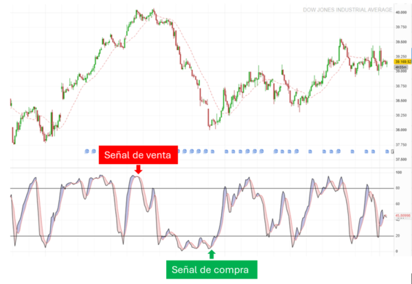 • Señal de Venta: Se genera cuando %K cruza debajo de %D por encima de 80. Esto sugiere que el activo está sobrecomprado y que es probable una corrección de precio.