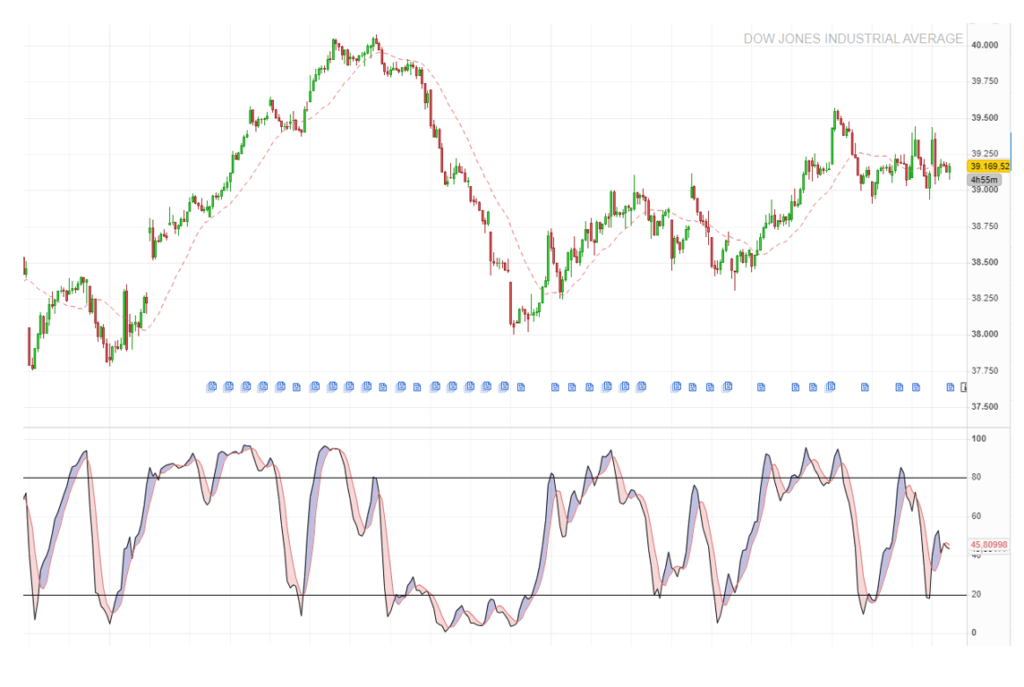2. %D: La línea lenta que es una media móvil de %K de tres periodos (aunque hay inversores que amplían este número y es habitual utilizar 5 periodos), ayudando a suavizar las fluctuaciones y generar señales más claras.