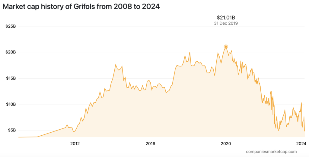 Grifols llegó a tener un valor en bolsa superior a los 21.000 M$ en 2019. Y me temo que lo mismo que le hizo crecer así en valor —las expectativas de un negocio explosivamente rentable y global— es lo mismo que la hizo caer después.