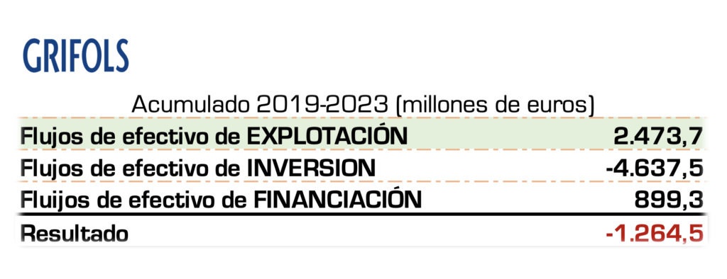 Quizás, la mejor forma de resumir la problemática es esta tabla. En ella se trata de estimar qué ha pasado con los flujos de caja de Grifols desde 2019: cuánto dinero generó su negocio, cuánto ha tenido que invertir y cuánto se ha financiado para ello.