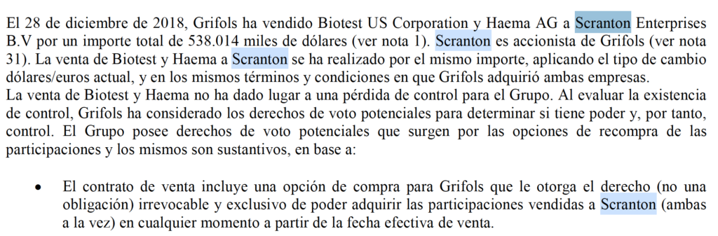 Lo que parece es que Grifols ha utilizado esa empresa para poder “vender” activos y hacerse con liquidez. Si vamos a la auditoría de 2018 se puede leer: