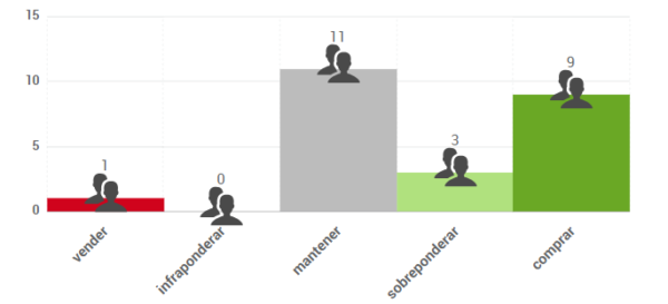 Según el consenso de analistas que recoge FactSet, el precio objetivo promedio se sitúa en 14,03€, lo que supondría haber agotado el potencial de revalorización teórico que a día de hoy le otorga el consenso. Las opiniones de los analistas que publica FactSet se distribuyen de la siguiente forma: