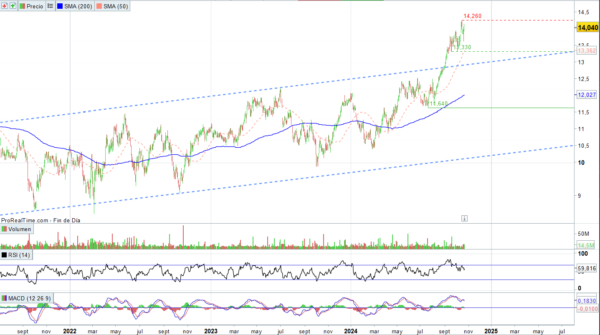 Iberdrola rompió en septiembre su rango lateral-alcista, lo que implica la reanudación de la tendencia alcista de largo plazo, con objetivo potencial en la zona de 15. Tiene soportes de corto plazo en los 13,33 y en la zona de 13 (techo del rango lateral roto al alza).