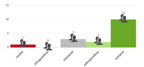 Según el consenso de analistas que recoge FactSet, el precio objetivo promedio se sitúa en 13 €, lo que supondría un potencial de revalorización del 30%. Las opiniones de los analistas que publica FactSet se distribuyen de la siguiente forma: