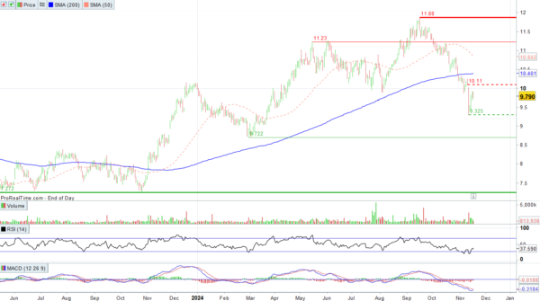 Rompió recientemente una estructura alcista de mínimos crecientes y parece haber hecho un suelo de corto plazo en 9,32. Una eventual superación de los 10,11 sería positiva y podríamos fijar un primer objetivo alcista en la zona de 11,23. Por debajo, tiene soportes en 8,72 y 7,27.