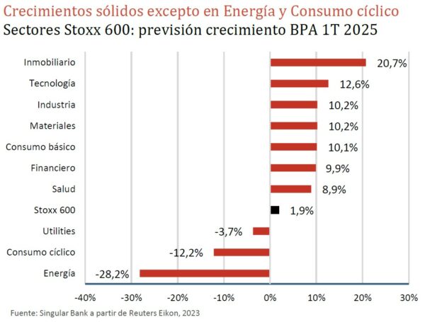 Para el conjunto del Stoxx 600 la previsión actual es de un crecimiento de un 1,9% en el 1T respecto al BPA del 1T de 2024. A 31 de marzo la previsión era de un -2%. Excluyendo el sector Energía, el BPA del 1T crecería un 7% interanual.