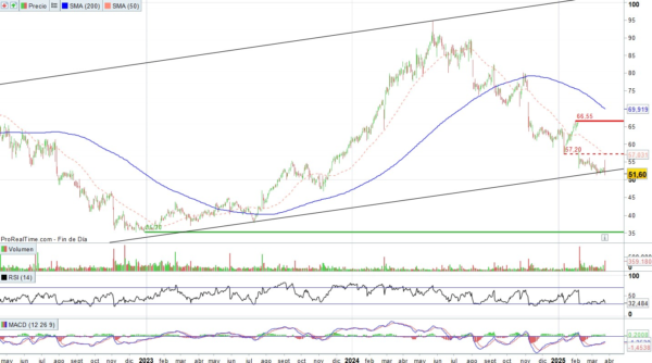 El valor se encuentra en tendencia bajista y acumula una fuerte caída desde su máximo histórico de mayo de 2024. La directriz alcista de largo plazo estaba actuando, en cierta medida, como soporte. La acción ha llegado a perder este nivel, pero todavía no lo ha hecho con claridad. Su pérdida implicaría un empeoramiento de su aspecto técnico. Por el contrario, la superación de los 57,20 sería muy positiva y permitiría marcar un objetivo potencial en los 66,55.