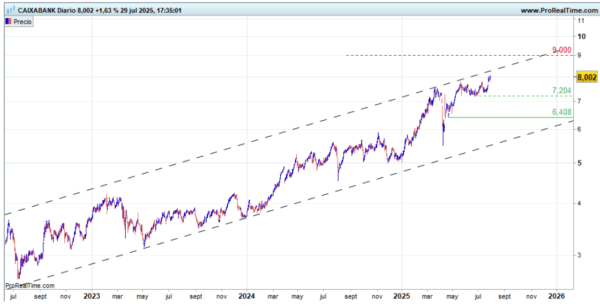 Análisis técnico: se encuentra en una tendencia alcista de largo plazo que se desarrolla por un canal con una proyección hacia la zona de 9,00€ a fin de año. A corto plazo el recorrido alcista adicional está limitado por la cercanía del techo del canal, lo que puede dar lugar a algún tipo de corrección/consolidación. La última corrección ha dejado una zona de soporte en torno a 7,20€. Aprovecharíamos cualquier retroceso hacia esa zona para añadir posiciones en el valor.