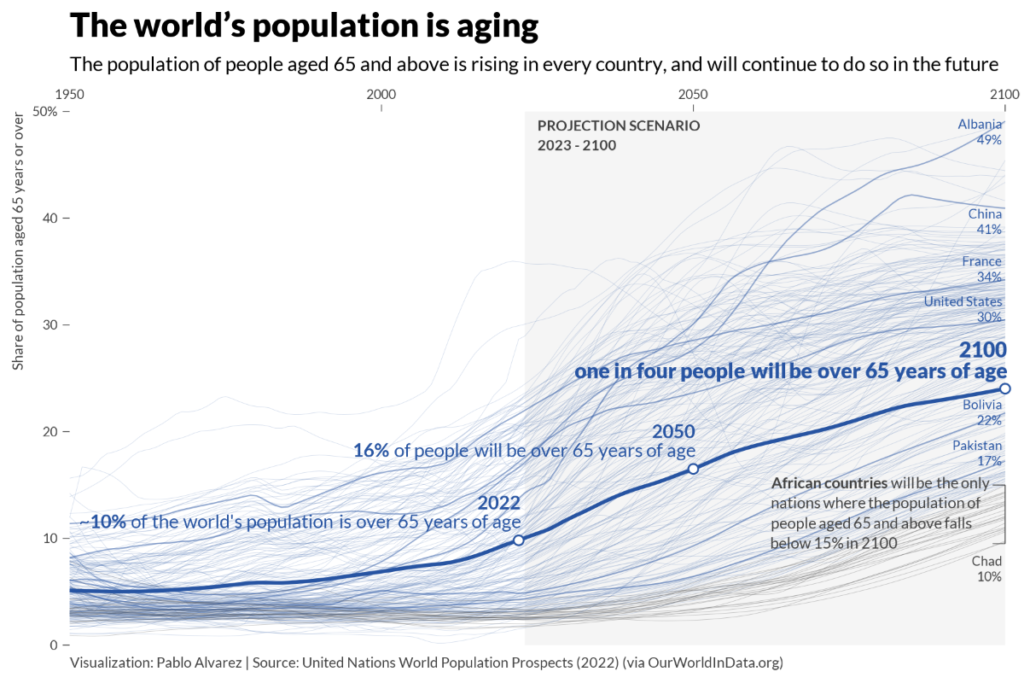 Se espera que la población de 65 años o más pase de 761 millones en 2021 a 1600 millones en 2050. Las personas de 80 años o más están aumentando incluso más rápido.