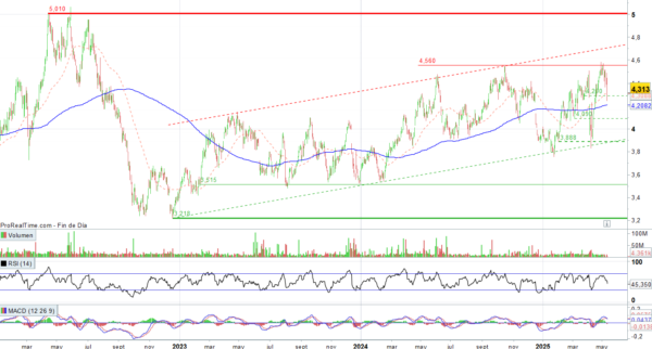 Se encuentra en tendencia neutral de largo plazo, en la banda 3,21 – 5,01. A corto plazo, ha caído en los últimos días desde la zona de 4,56, donde tiene una resistencia. Como soportes de trading tendríamos los 4,29 (retroceso del 61,8% sobre la caída de entre julio y octubre) la media de 200 sesiones, 4,09 (retroceso del 50%) y 3,88 (retroceso del 38,2%).