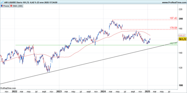 Las compañías de gases industriales mantienen un crecimiento estable a largo plazo por la creciente utilización de gases limpios en los procesos industriales. Son compañías growth que cotizan con múltiplos elevados, que la corrección de 2024 ha dejado en niveles razonables. Técnicamente la corrección se ha estabilizado en una zona de soporte relevante propicia para la formación de un suelo. Creemos que los niveles actuales ofrecen una oportunidad para incorporarse a una tendencia alcista secular, que esperamos continúe en los próximos años.