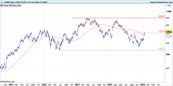 Es otro de los grandes sectores de crecimiento en Europa que da muestras de reactivación tras la publicación de resultados de algunas compañías. La gran corrección de Louis Vuitton presenta indicios de haber hecho suelo en la zona de soporte clave de 535€. La superación esta semana de la resistencia de 708€ y de la media de 200 sesiones apunta a un movimiento de vuelta a los máximos de 900€ en los próximos meses.