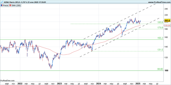 Las compañías de infraestructuras son uno de los segmentos más fuertes del mercado en los últimos meses. Aena mantiene una tendencia alcista impecable desde octubre de 2022 que le proyecta hacia la zona de 240€ a medio plazo. A corto plazo está desarrollando una consolidación lateral con un soporte muy definido en 194€, ofreciendo un punto de entrada atractivo, con un nivel de riesgo limitado si se sitúa un stop por debajo de ese nivel.