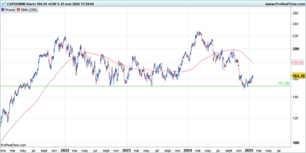 La consultora francesa ha desarrollado una intensa corrección en los últimos meses, en el contexto de la crisis política en Francia y la debilidad en algunos de sus mercados principales en Europa. Aunque no se espera una mejoría en este sentido hasta la segunda parte del año, el mercado podría empezar a anticiparla tras la fuerte corrección y el descuento que presenta frente a sus comparables de EEUU. Técnicamente ha formado una pequeña figura de suelo en una zona de soporte muy importante, por lo que puede ser razonable hacer una primera entrada, para añadir posiciones a medida que se consolide una estructura alcista de corto plazo. La zona de 180€ es su primera resistencia importante. La eventual pérdida de la zona de 151€ invalidaría este escenario.