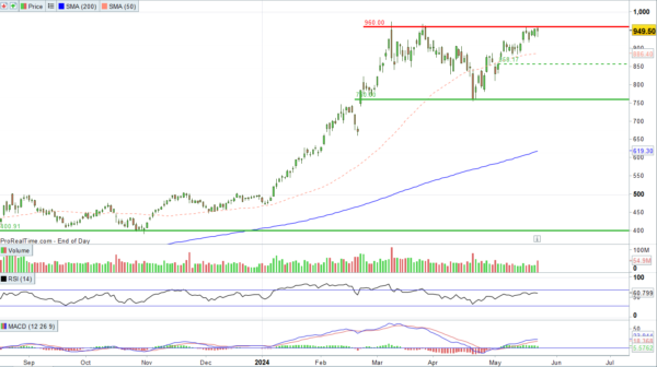 Nvidia está en tendencia alcista de largo plazo, cotizando en su zona de máximos históricos, que previsiblemente superará hoy. A corto plazo, lleva más de 2 meses cotizando en el rango 760 – 960, que según la cotización en las operaciones de después de cierre, puede superar con claridad, lo que le dejaría en subida libre, sin resistencias.