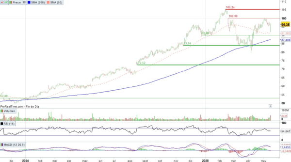 Walmart se está recuperando de su reciente corrección, tras haber establecido máximos históricos en febrero. Parece estar tratando de consolidar en el rango 90 – 100. La superación de los 100 permitiría al valor cerrar el hueco bajista que dejó en febrero y aún no ha sido cubierto. A su vez, su eventual superación de la zona de 105 podría dar lugar a la reanudación de la tendencia alcista de largo plazo. Observamos soportes en 90, en la media de 200 sesiones, en 84 y en 72,50.