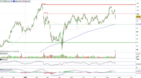 Walmart perdió ayer, tras presentar resultados, el soporte de la zona de 100, que había sido el límite superior del rango de consolidación lateral anterior. Es probable que siga consolidando dentro del rango 94 – 100. Como soportes de corto plazo a vigilar, tendríamos la media de 200 sesiones y la zona de 94. Una eventual pérdida clara de este nivel supondría un deterioro de la situación técnica del valor, mientras que la superación de la zona de 100 nos daría una señal alcista.