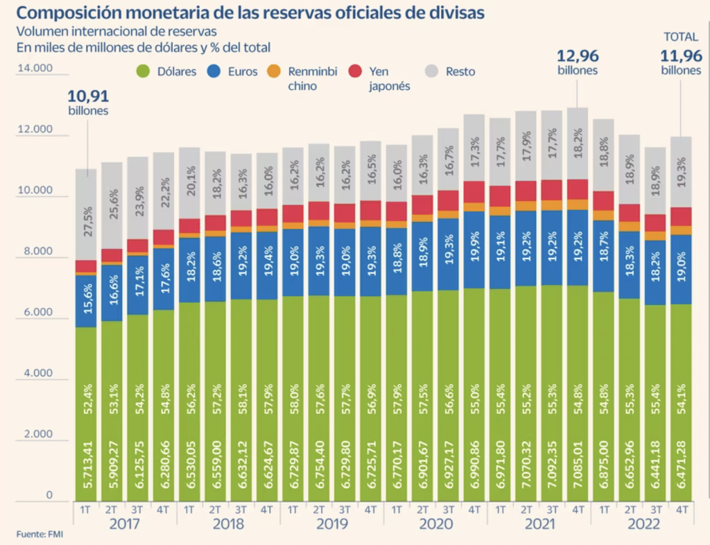 Cembalest opina en un informe de abril que la disminución de las reservas absolutas en dólares es principalmente un reflejo de los cambios de valoración en las carteras de reservas, a medida que subieron las tasas de EE UU y bajaron los precios de los bonos, yen y euro. “Japón vendió 50.000 millones de dólares para detener la caída del yen el año pasado y esto no es un evento de diversificación del dólar. Asimismo, los datos del FMI solo reflejan las asignaciones de reservas de divisas del banco central. Otros tenedores importantes de títulos de deuda de EE UU incluyen fondos soberanos y bancos estatales, y tampoco hay evidencia de desdolarización”, dice el experto.