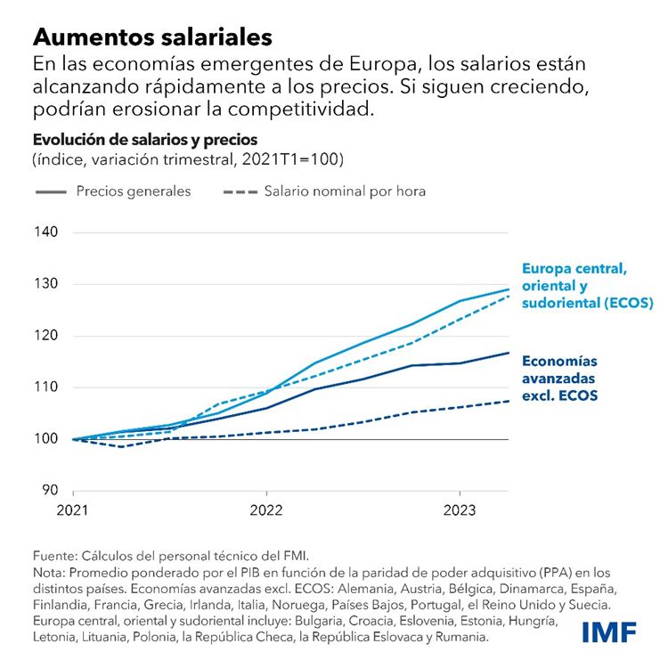 Como resultado de esas fuerzas contrapuestas, efectivamente las economías europeas se han desacelerado este año. Para todo 2023, pronosticamos un crecimiento de 0,7% en las economías avanzadas de Europa, frente a la tasa de 3,6% alcanzada en 2022 en la recuperación tras la pandemia. Se prevé que la ralentización de las economías de mercados emergentes de Europa (excluidas Belarús, Rusia, Türkiye y Ucrania) toque fondo este año, con un crecimiento de 1,1%.