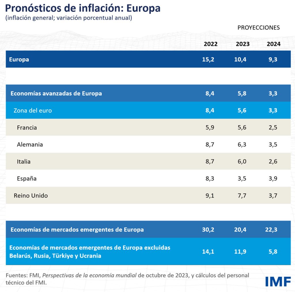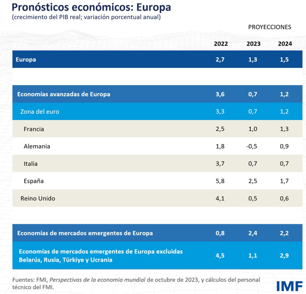 Las perspectivas deberían mejorar gradualmente a partir de entonces, y en 2024 el crecimiento se elevaría hasta 1,2% en las economías avanzadas y 2,9% en las economías emergentes del continente europeo (excluidas Belarús, Rusia, Türkiye y Ucrania).