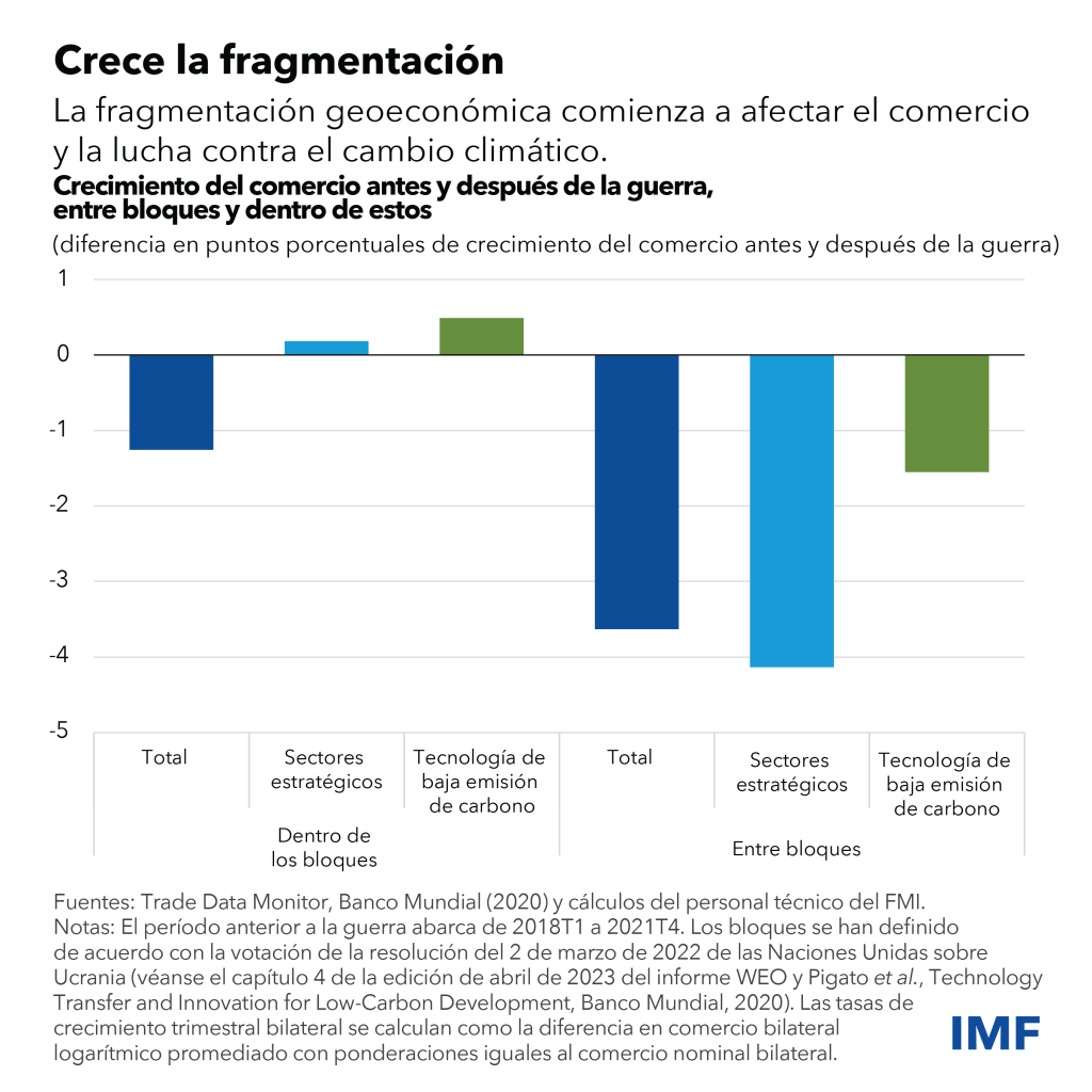 Las reformas que alivien las restricciones más limitantes para la actividad económica, como las de la gobernanza, la regulación empresarial y el sector externo, pueden fomentar un aumento de la productividad, al activar la productividad latente, según muestra nuestro estudio. Otra posibilidad para reforzar el crecimiento es limitar la fragmentación geoeconómica; por ejemplo, eliminando aquellas barreras comerciales que obstaculizan los flujos comerciales entre bloques geopolíticos opuestos, como los de tecnología de baja emisión de carbono, que tan urgentemente necesitan los países emergentes y en desarrollo.