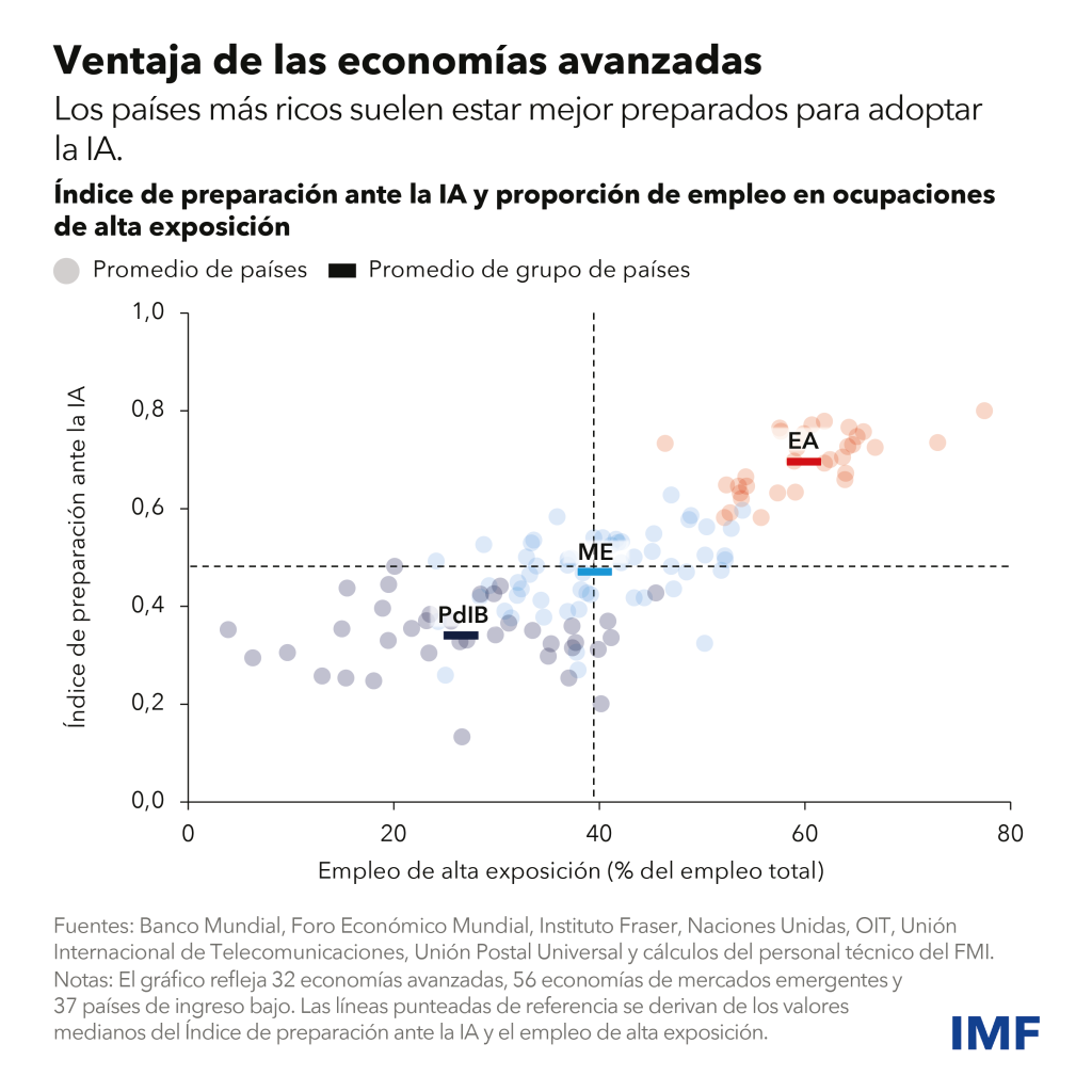 En los mercados emergentes y los países de ingreso bajo, en cambio, se prevé que la exposición a la IA sea de 40% y 26%, respectivamente. Estos hallazgos hacen pensar que, en las economías de mercados emergentes y en desarrollo, la IA provocará menos trastornos. Al mismo tiempo, muchos de estos países no cuentan con la infraestructura ni la fuerza laboral cualificada necesaria para explotar las ventajas de la IA, lo cual crea el riesgo de que, con el tiempo, la tecnología profundice la desigualdad entre las naciones.