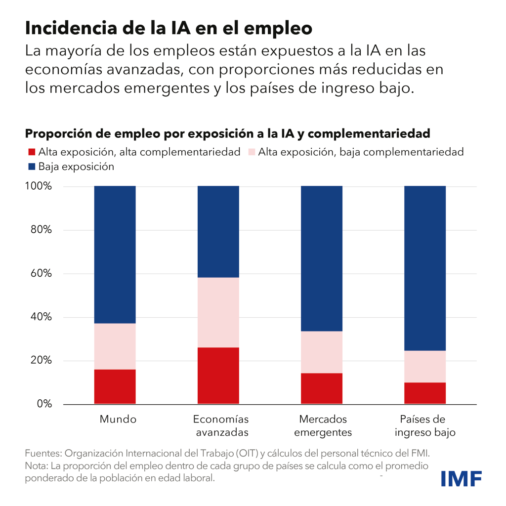 En las economías avanzadas, alrededor de un 60% de los empleos pueden verse afectados por la IA. Aproximadamente la mitad de los empleos que están expuestos podrían beneficiarse de la integración de la IA, que mejoraría la productividad. En la otra mitad, las aplicaciones de IA pueden ejecutar tareas que en la actualidad son realizadas por seres humanos, lo cual podría reducir la demanda de mano de obra, con una consiguiente merma de los salarios y la contratación. En los casos más extremos, algunos empleos pueden desaparecer.