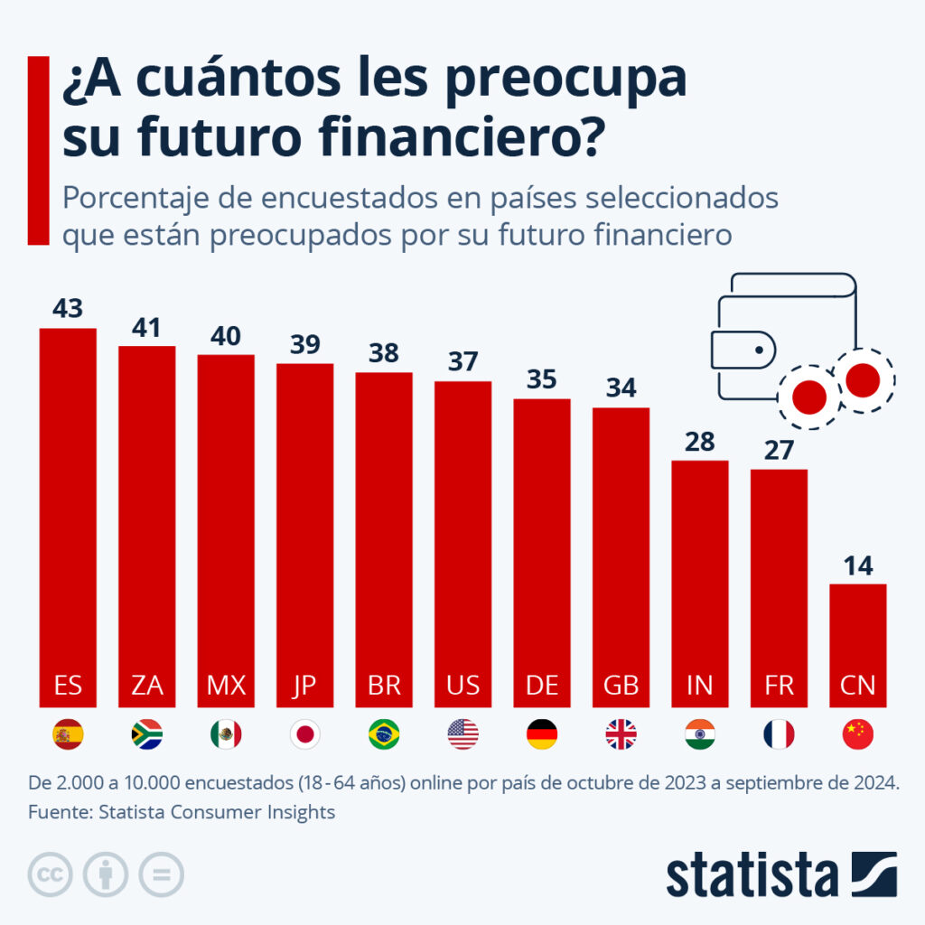 En este contexto, no es de extrañar que bastantes personas sientan preocupación al pensar en su situación económica no sólo actual, sino también futura, temiendo por el estado de sus finanzas personales. Según los datos de la macroencuesta Statista Consumer Insights, el 37% de los encuestados en Estados Unidos respondieron afirmativamente a la pregunta de si están preocupados por su futuro financiero, cifra similar a la registrada en Reino Unido (34%) y Alemania (35%). La proporción es aún mayor en países como México (40%) y España (43%). En cambio, las finanzas personales parecen no ser un motivo de inquietud para un porcentaje tan elevado de encuestados en las regiones urbanas de China, pues sólo una séptima parte de los entrevistados en el país reconoció estar preocupado por el estado futuro de su situación financiera.
