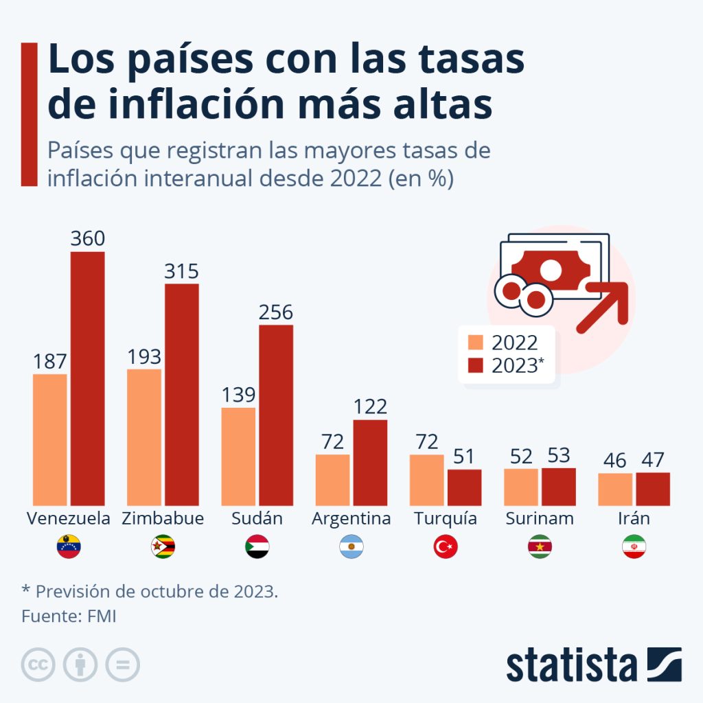 Argentina es el cuarto país con la tasa de inflación más alta del mundo (122%) en 2023, según los últimos datos del Fondo Monetario Internacional (FMI) publicados en octubre. Venezuela ocupa el primer lugar, y es el décimo año consecutivo en que la tasa de inflación en este país se encuentra entre las más altas del planeta, aunque es considerablemente más baja que en 2018, cuando alcanzó el astronómico valor del 65.000%. Como muestra nuestra infografía, otros dos países están experimentando una inflación notable este año: Zimbabue, con una tasa del 315%, y Sudán (256%).