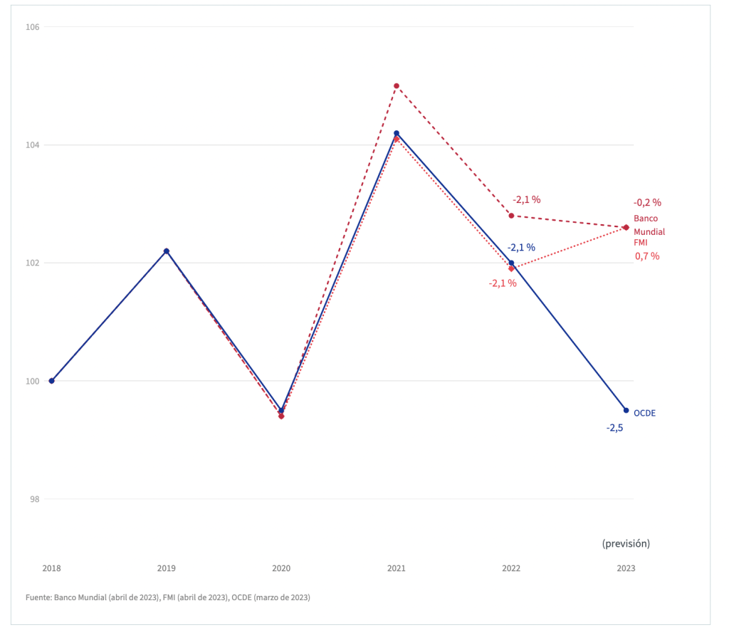 Es posible que la economía rusa siga contrayéndose en 2023. Se prevé que su PIB disminuya un 2,5 % en la hipótesis más pesimista (OCDE) o un 0,2 % según el Banco Mundial. El FMI espera que haya crecimiento en 2023 (0,7 %).