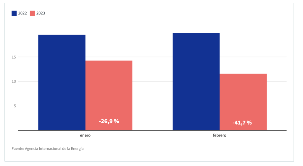 Según la Agencia Internacional de la Energía, los ingresos procedentes del petróleo de Rusia disminuyeron más de una cuarta parte en enero de 2023 (en comparación con enero de 2022). La caída en febrero fue aún más importante (más del 40 %).