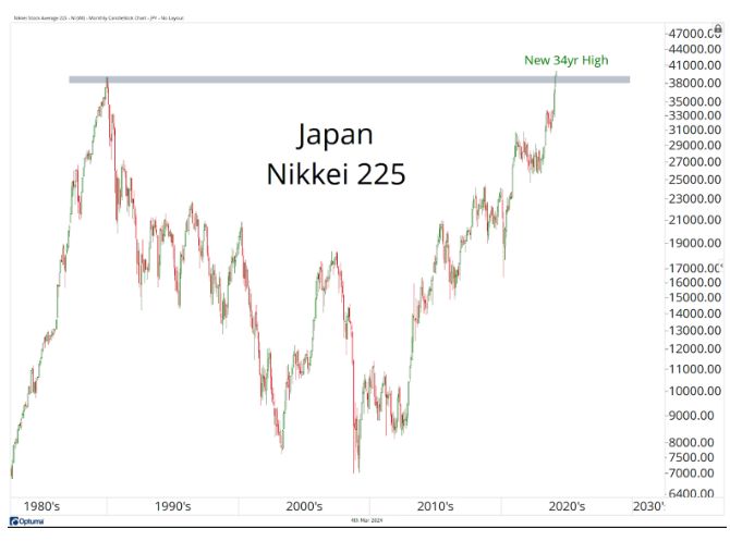 Fuera de Estados Unidos, las cosas están mejorando para los índices bursátiles de todo el mundo. Ya sea que miremos a Europa, Asia o América Latina, los alcistas mantienen el control a medida que la participación se expande gradualmente a más y más países. El siguiente gráfico muestra el Nikkei 225 de Japón cerrando en nuevos máximos históricos: